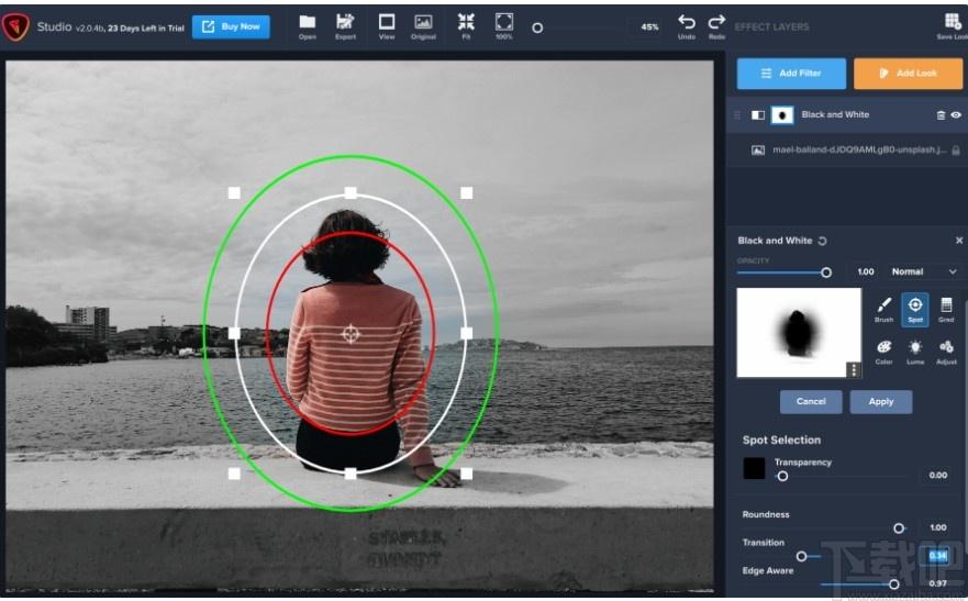 在此示例图像中,我从“效果层”面板应用了黑白效果。我想让拍摄对象和她的彩色毛衣成为我的焦点,所以让我们尝试点斑面具。