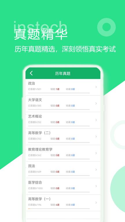 为考试的同学提供了充分的复习准备,可随时随地学习练习,有效帮助顺利通过考试。本软件为全国各类成人高考专升本、高起点考试的软件,专升本包括政治,大学语文,艺术概论,高等数学(二),高等数学(一)、英语、教育理论教育学,民法,医学综合等科目,高起点包括语文、历史地理、数据,物理化学、英语等,准备了最新冲刺押题试卷、最新历年真题、考点汇总等。